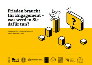 Friedens- und entwicklungspolitische Organisationen, darunter kirchliche Hilfswerke und ökumenische Initiativen, haben gemeinsam friedenspolitische „Wahlprüfsteine“ erarbeitet. Diese umfassen einen Katalog mit konkreten Fragen, die Menschen gestellt werden können, die sich